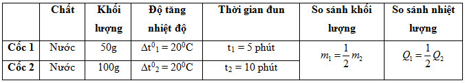 - Yếu tố ở hai cốc được giữ giống nhau là : Độ tăng nhiệt độ và chất (nước). Yếu tố được thay đổi là : Khối lượng.
