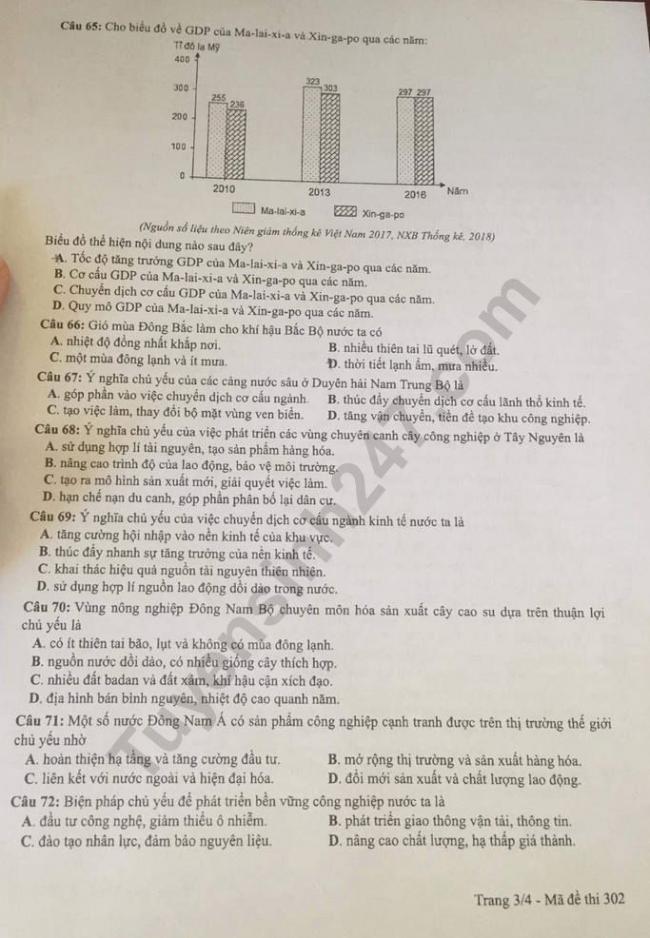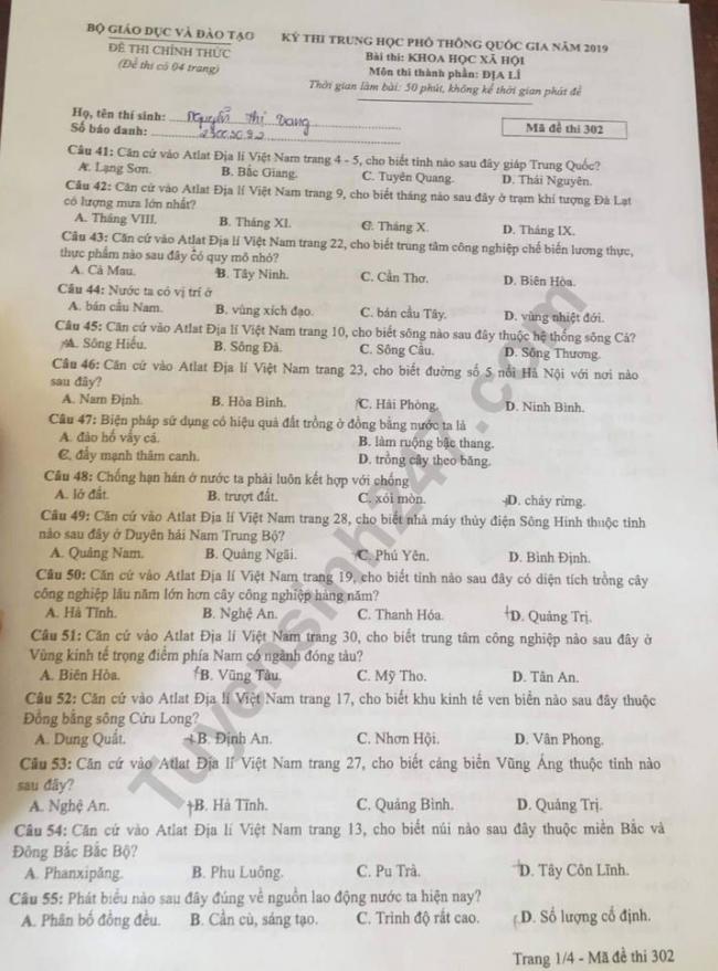 Đáp án chính thức cho đề thi THPT quốc gia môn Địa Lý năm 2019 (Mã đề 302) Đề thi môn Địa Lý mã đề 302 Đáp án tham khảo mã đề 302