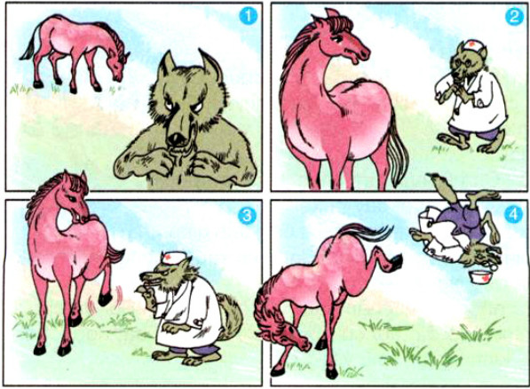 - Tranh 1 : Trông thấy Ngựa đang gặm cỏ, Sói ta thèm thuồng đến rỏ dãi.