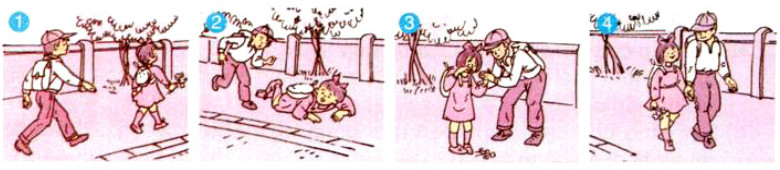 Em quan sát kĩ 4 bức tranh, chú ý những hành động, cử chỉ của bạn nam với em nhỏ và kể câu chuyện.